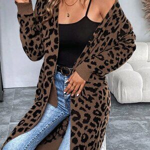 Brown Casual Women's Long Sleeve Leopard Print Long Cardigan Sweater