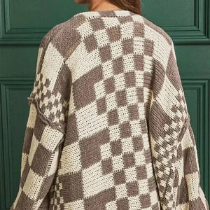Brown Casual Women's Open Front Mixed Checkered Pattern Knit Cardigan