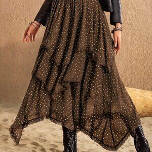 Elevate your casual wardrobe with this long, loose-fitting asymmetrical skirt in a rich brown hue, featuring a playful polka-dot pattern for a boho touch.