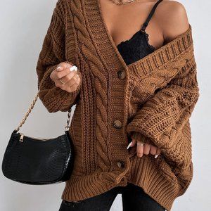 Brown Casual Womens Solid Button Front Cable Knit Cardigan