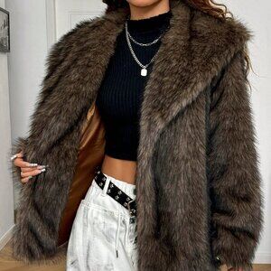 Brown Casual Women's Solid Color Long-Sleeved Open-Front Loose Faux Fur Coat