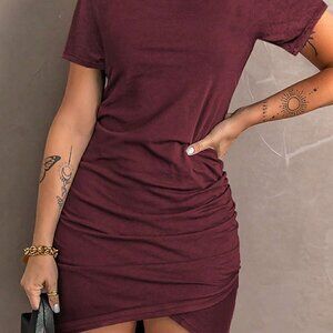 Brown Casual Womens Solid Ruched Tulip Hem Dress