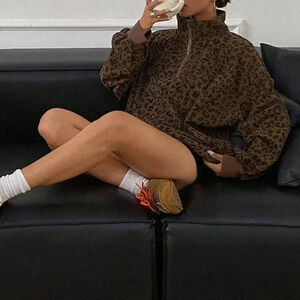 Brown Casual Women's Zip Up Front Long Sleeve Leopard Print Sweatshirt