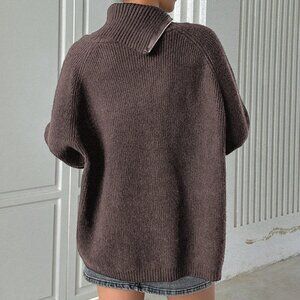 This casual cardigan sweater features a convenient zipper front and a loose, comfortable fit. It has an asymmetrical neck and extra-long sleeves, making it perfect for late fall weather. The plain design ensures a versatile look, while the brown color adds a warm touch.