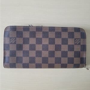 Stylish checkered snap brown wallet. There are a few flaws missing pull on zip pocket see picture. Smells like leather can not validate.