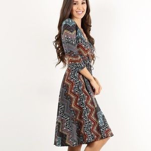 Patterned chevron printed wrapped a-line dress with v-neckline, 3/4 sleeves, and waist tie. Material: 95%Rayon and 5%Spandex. Color: Multi Measurements: Small: Bust 16 inches Waist 28 inches Length 39 inches Medium: Bust 17 inches Waist 30 inches Length 39 inches Large: Bust 19 inches Waist 32 inches Length 39 inches