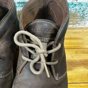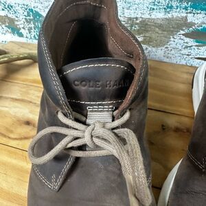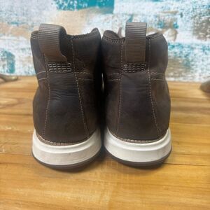 These brown chukka boots are designed with a soft suede upper and feature light gray laces for a stylish touch. The rounded toe and contrasting white sole add to their casual elegance, making them a versatile choice for any occasion.