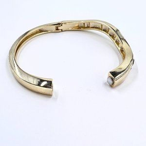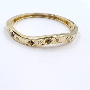 Brown & Clear Gemstone Gold Tone Hinged Cuff Magnetic Closure Bracelet. Bracelet is a size 2.6 and is approx. .25” wide. Bracelet is hinged with a magnetic closure. Bracelet is previously loved and has minor scuffing and some pitting in the clasp and hinge areas, please look at the pictures carefully. Bracelet is in good condition.