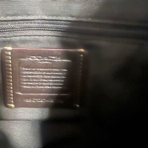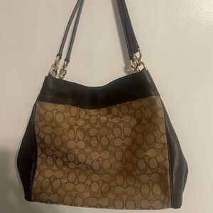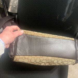 Beautiful brown Coach signature fabric & leather bag. It has a center zipper compartment with pockets on both sides. It has brass hardware and its original hang tag. It is in excellent condition.