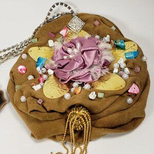 Brown Coin Purse with Pink Satin Flower, Gems & Gold Leaf – Statement Mini Bag
