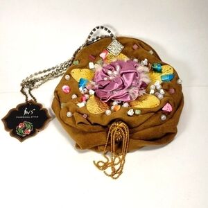 Make a bold and unique style statement with this one-of-a-kind brown coin purse, adorned with vibrant embellishments! Featuring a beautiful pink satin rosette flower at the center, framed by gold-tone leaves, faux pearls, colorful stones, and a sparkling rhinestone chain strap, this compact accessory adds flair to any outfit.