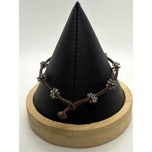 Brown Cord Bracelet Silver Tone Flower Charms Adjustable Boho Jewelry