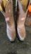 Stylish brown cowboy boots featuring pink floral embroidery. Perfect for adding a western flair to any outfit.