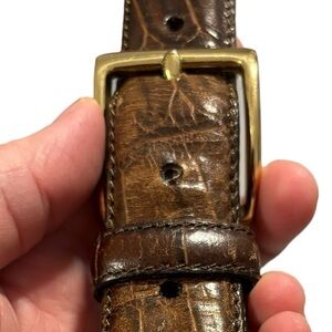 This is a nice pre-owned genuine leather brighton copycat brown croc belt. Croc design brass buckle designer business casual formal