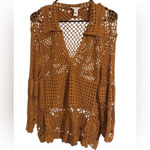 Stylish brown crochet knit sweater with a unique design. Perfect for layering. P2P:23" Length:26.5"