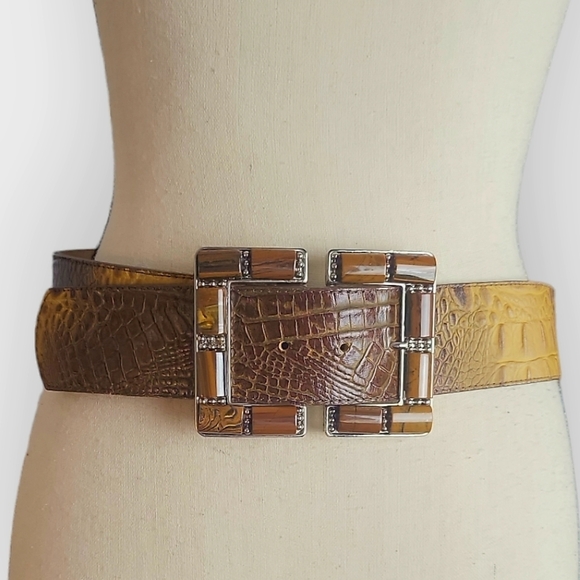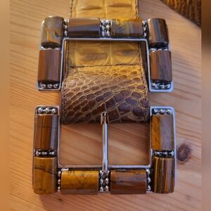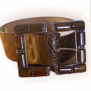 Elevate your style with this elegant brown crocodile pattern belt. Featuring a striking silver buckle, this accessory adds a touch of sophistication to any outfit.