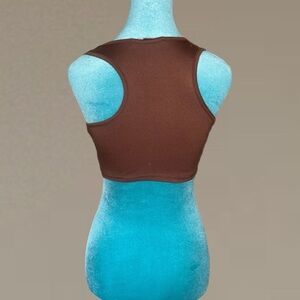 Stylish brown crop top featuring floral embroidery in blue and yellow.