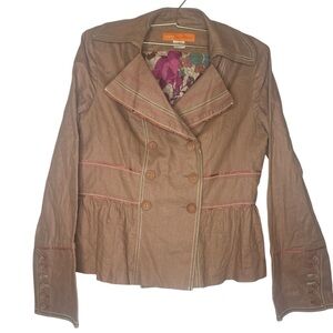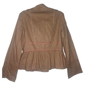 This CYNTHIA STEFFE Anthropologie khaki jacket blazer is a must-have for any fashion-forward woman. With a peplum style, button closure, and a colorful rainbow knit design, this jacket is perfect for adding some pizzazz to any outfit. Made with high-quality linen fabric, this jacket is durable and comfortable to wear. It comes in a size 6 and is perfect for anyone looking for a stylish and trendy jacket to complete their wardrobe. It is a great addition to any collection. "New condition, just missing tags."