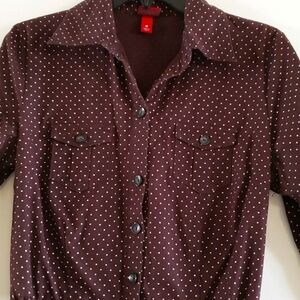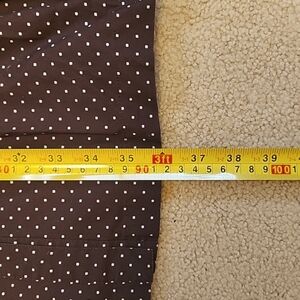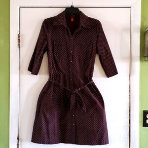 Brown button down Dress with White polka-dots. Has a tie around waist & 2 button pockets on chest. Sleeves are 3/4.
