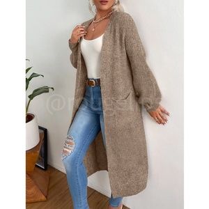 Brown (Khaki Mocha) Duster Cardigan Front Pockets Cable Knit