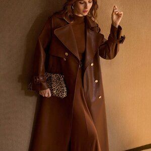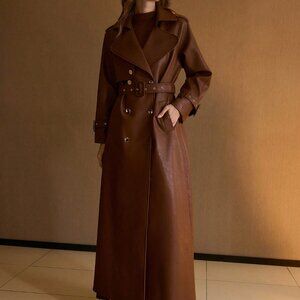 This elegant women's trench coat features a double-breasted belted design, perfect for late fall. It has an oversized fit, long length, and long sleeves with a lapel neckline and plain pattern, ideal for adding a touch of sophistication to any outfit.