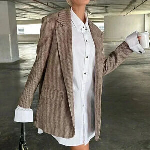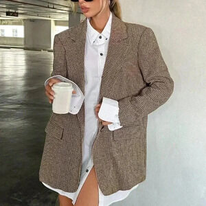 Brown Elegant Women's Lapel Collar Houndstooth Suit Jacket