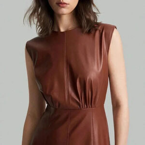 Brown Elegant Women's Round Neck Sleeveless Wide Shoulder PU Dress