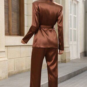 Brown Elegant Womens Satin Finish 2 Piece Suit with Metal Buckle Belt