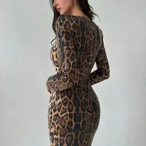 Brown Elegant Women's Sexy Sequin Leopard Print Square Neck Cocktail Dress