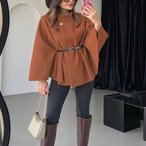 Brown Elegant Womens Stand Collar Loose Poncho Cloak Jacket