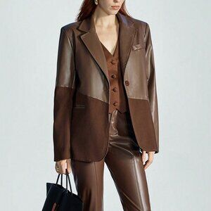 Brown Elegant Women's Style Asymmetrical Design Woven Fabric Patchwork Blazer