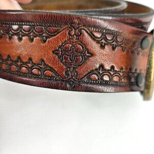 Vintage Brown Embossed Leather Belt With Antique Brass Buckle Unisex 1.75" Width Unique Pattern Made in the USA