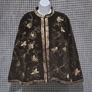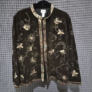 Brown Embroidered Floral Velvet Jacket SzXL Chicos 3 Gold Asian Beaded Boho Glam