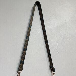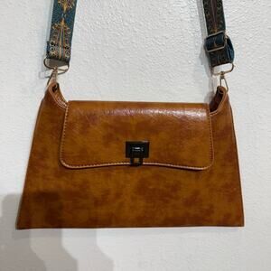 Brown purse with teal, yellow, red and green guitar strap purse in excellent preowned condition.