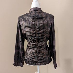 Combination of a Mocha and Chestnut colors. Jacket goes to the waist. It's very light weight and is not lined. It's more of a fashion jacket than something used for warmth. This is extremely versatile and can be worn casual with jeans or easily dressed up. Material is soft and silky and a little shiny. It's never been worn so brand new but the tags are removed. I bought at a small boutique. It's a polyester/nylon blend and is machine washable.