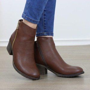 Brown Faux Leather Ankle Boots W/ Gold Zipper Block Heel