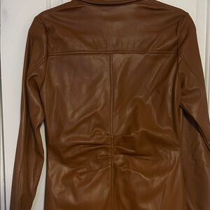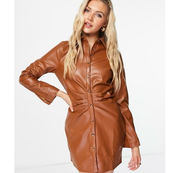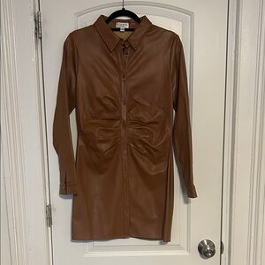 Stylish brown faux leather shirt dress with button details. Perfect for a chic look.
