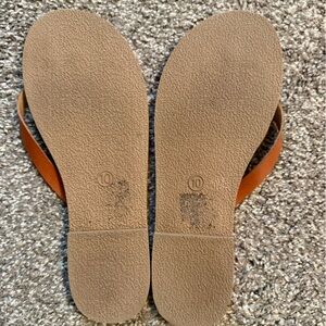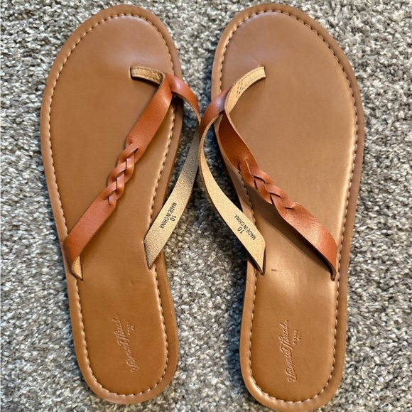 Stylish brown leather flip flops with braided strap detail. Perfect for casual wear.