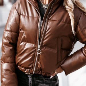 Brown Faux Leather Padded Cropped Puffer Jacket