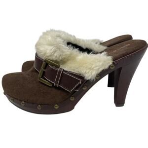 Brown Faux Suede Heeled Clogs With Faux Fur Trim Size 8.5