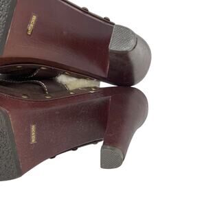 Brown Faux Suede Heeled Clogs With Faux Fur Trim. Size 8.5. Slip-on heeled clogs trimmed with gold-tone metal brads near sole and buckle strap at upper. Soles are in like-new condition. Minor scuffing at heel and at brad trim. See all pics which are best descriptors of wear.