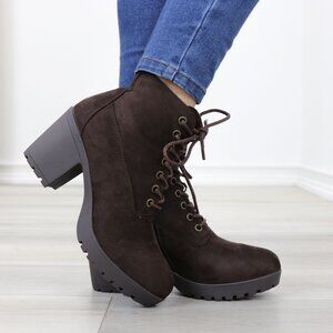Brown Faux Suede Lace-Up Lug Chunky Block High Heel Ankle Boots