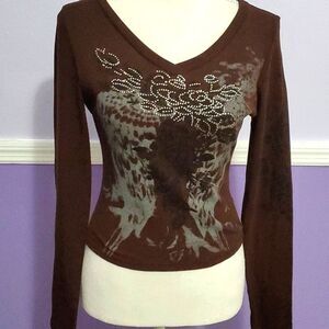 Wear this brown fitted long sleeve crop top with your favorite jeans. Floral bling and angel wings print for a biker or emo look. Stretchy knit that appears to be a polyester blend.