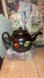 Good vintage to antique condition. Lid has chipping, with most on the underside. There is a little wear to the hand painted floral, mostly on one side. Lid is stamped England. Base has been numbered. Piece looks early to mid century and has the most adorable downward turned spout. Item is in the Brown Betty category of collectible tea pots. Measurements approximately 9”Lx5.5”Hx5”D.