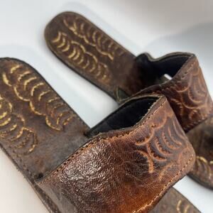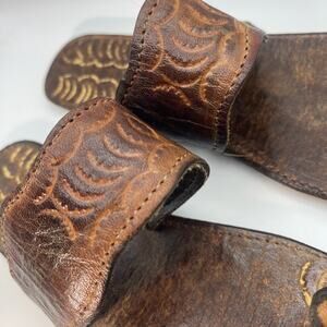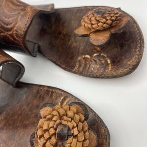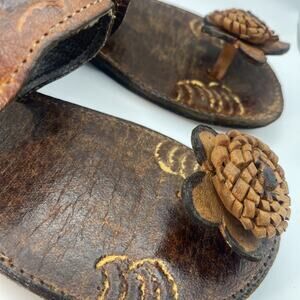 The Brown Flower Hand Stitch Embroidered Sandals are a unique and comfortable option for casual occasions during the summer season. Made with brown leather and featuring a floral pattern with embroidered accents, these sandals have a flat heel and a flip flop style for easy wear. With a US shoe size of 8, these sandals are designed for women who appreciate feminine and trendy footwear. Perfect for adding a touch of flower-themed charm to any outfit.
