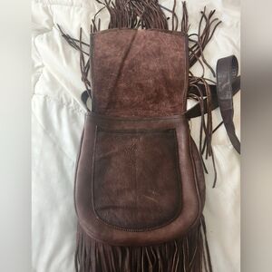 Stylish brown leather crossbody bag with fringe detailing. Perfect for adding a bohemian touch to any outfit.