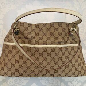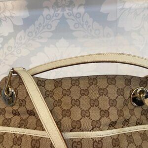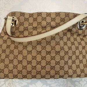 Brown medium sized Gucci Canvas shoulder bag with double handles. Very Y2K..