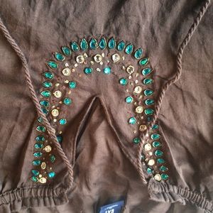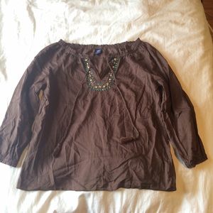 Brown blouse from gap with beautiful turquoise and white beads. Peasant style with drawstrings. Lightweight and perfect for spring