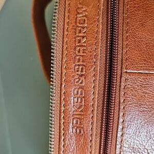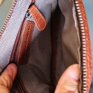 Stylish and durable brown genuine leather unisex bag, perfect for everyday use. lots of pockets. measurements are in photos. the strap is about 34". Great used clean condition.