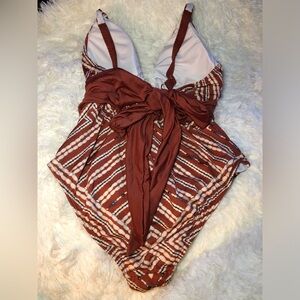 Dive into style with this one-piece swimsuit featuring a striking brown and white geometric pattern. The plunging V-neckline and thin straps add a touch of elegance, while the solid brown sash at the waist creates a flattering wrap effect. Perfect for making a statement at the beach or pool.